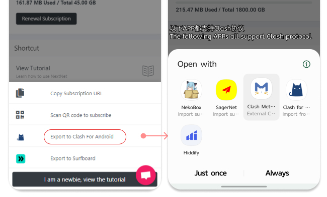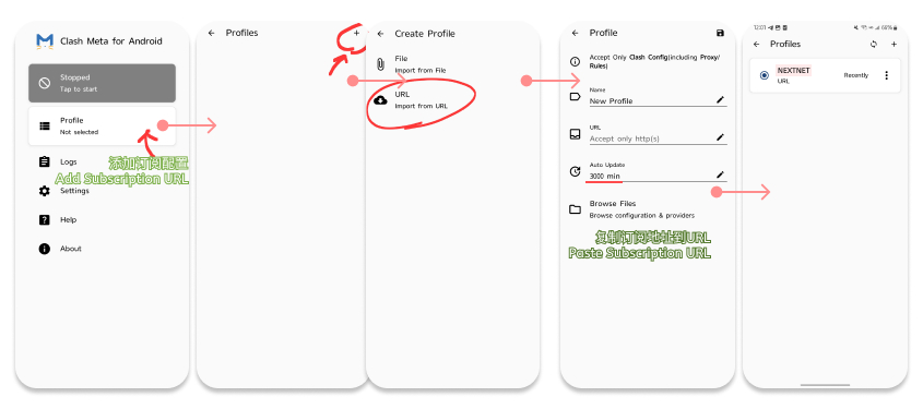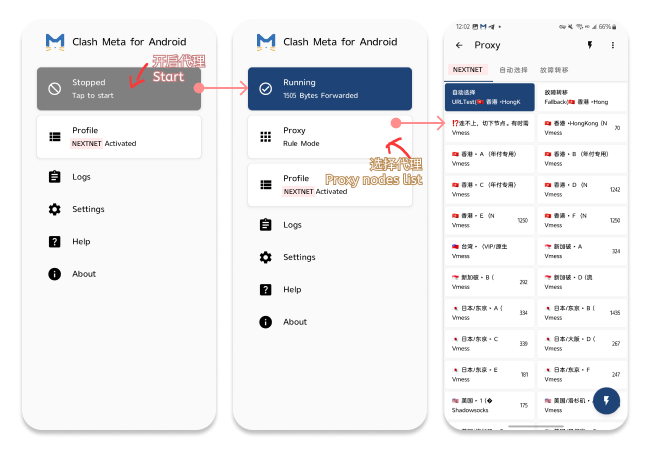 安卓手机浏览器输入 go.NextNet.one (图A0),选择 订阅 ➔ 我的订阅 ,找到“一键订阅”按扭,点击『导入到Clash Meta for Android』,自动弹出 Clash app ,点击 NextNet 配置(图A1),返回,连接运行(图A2)。点击『代理』选择自已合理的节点(图A3),就像这样就完成了。