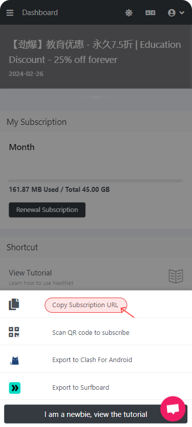 - 首先,安卓手机浏览器输入 go.NextNet.one,选择 订阅 ➔ 我的订阅 ,找到“一键订阅”按扭,点击『复制订阅地址』。